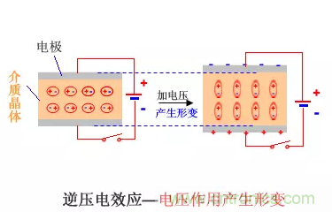 對具有壓電特性的介質(zhì)材料施加電壓,則產(chǎn)生機械應(yīng)力,發(fā)生形變。