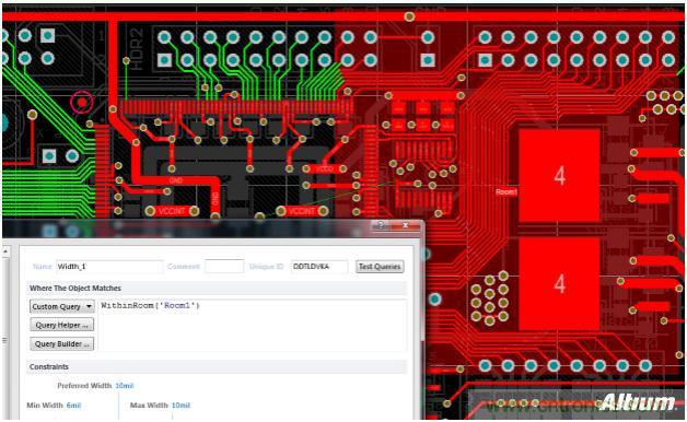 在PCB規(guī)則定義中,比如要對(duì)一塊特定的區(qū)域采用不同的規(guī)則,那么Room是解決這類問(wèn)題的首選。首先用Room框出這一塊特定區(qū)域并命名為Room1。然后在規(guī)則定義里選擇WithinRoom(''Room1'') ,之后可以為這個(gè)Room里的對(duì)象設(shè)置各種規(guī)則。比如下圖所示,線寬規(guī)則全部違反了最小線寬設(shè)定值,所以都有綠色高亮顯示。然后為右邊的區(qū)域框選了Room1,分別為其設(shè)置了較寬的線寬值10mil,那么Room里的線寬符合規(guī)則定義,已經(jīng)顯示正常,沒(méi)有綠色高亮違規(guī)顯示了。但同一根網(wǎng)絡(luò)的