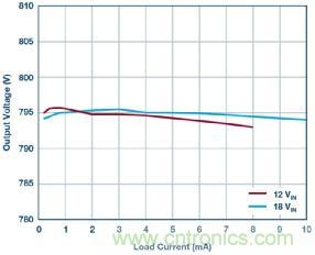 圖 4 顯示一款完整的 4 V~18 V 輸入至 800 V 輸出解決方案,其能夠提供高達 10 mA 的輸出電流。當(dāng)輸入為 18 V 和負載電流為 10 mA 時,該反激式轉(zhuǎn)換器可實現(xiàn) 88.2% 的峰值效率。圖 5 顯示各種不同輸入電壓下的效率曲線;圖 6 顯示了卓越的負載調(diào)節(jié)性能。另外,該解決方案采用的組件較少。