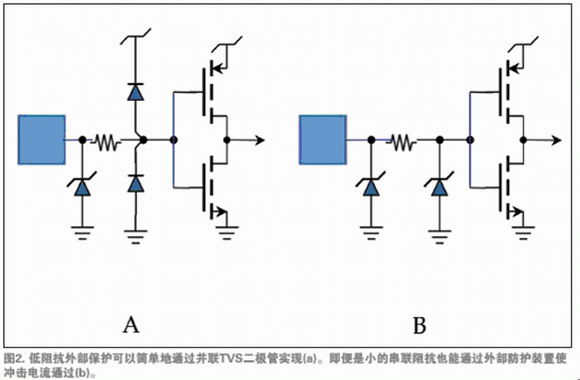 設(shè)計時,可以保護(hù)簡單低速的單端輸入/輸出(I/O)線,開發(fā)利用類似于IC制造商使用的拓?fù)浣Y(jié)構(gòu)。實(shí)際上,如果選擇了更有效的抑制器,并且將其放置在離瞬態(tài)切入點(diǎn)盡可能近的位置,產(chǎn)品的瞬態(tài)承受能力將會大大地提高。如果輸入/輸出線需要低阻抗回路,可以簡單地使單一的TVS二極管鄰近信號的外部連接器(圖2a)。這個處理方法會使外部和芯片上的二極管共享電流。