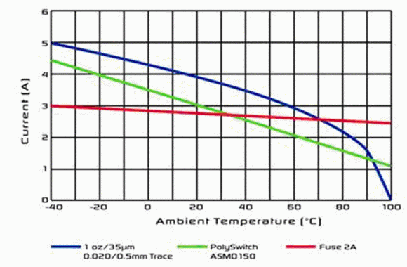 必須注意的是,在整個溫度范圍內(nèi),PPTC器件的觸發(fā)電流是如何跟隨印制線上的電流。在這兩種情況中,即使可以使用熔斷器,在汽車高于有用的標準溫度下,尺寸最接近的熔斷器也不能保護它。