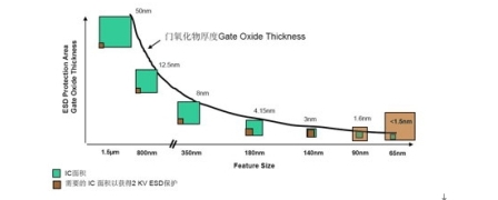 相信所有人都希望ESD防護能完全地集成到IC芯片內部,因為這樣會節(jié)省的板級空間,減少系統(tǒng)成本并降低設計與布線的復雜度。但從目前情況來看,前景并不樂觀。如今,IC制程工藝的進步成了片上ESD保護的一大難題。一方面,工藝的進步雖提升IC的性能與集成度并降低功耗與尺寸,但由于柵極氧化層厚度越來越薄,IC自身的ESD防護能力反而降低。另一方面,隨著IC尺寸的不斷減小,由于受到空間的限制,因此保護能力有限。