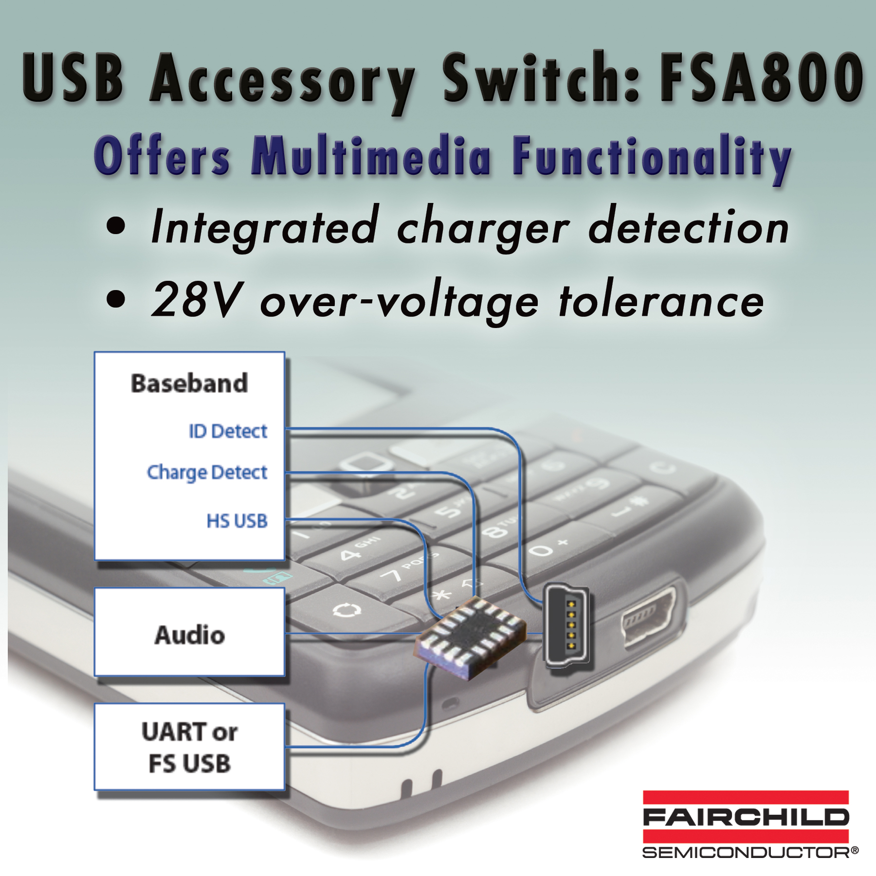 飛兆半導(dǎo)體公司 (Fairchild Semiconductor)為手機、PDA和MP3播放器設(shè)計人員提供全新USB附件開關(guān)產(chǎn)品FSA800。FSA800是業(yè)界最小的器件,將所有主要的多媒體功能集成進(jìn)薄型UMLP封裝(1.8mm x 2.6mm x 0.55mm)中。它具有內(nèi)置充電檢測功能、28V的過壓容差、內(nèi)置終止電阻器,以及負(fù)擺幅功能。通過在緊湊型封裝中集成了多種功能,可以簡化便攜設(shè)計并減少外部元件數(shù)目。