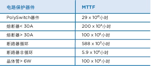表2按照電信行業(yè)的可靠性預(yù)測標(biāo)準(zhǔn)Bellcore TR332比較了PolySwitch器件與其他電路保護(hù)器件的MTTF。