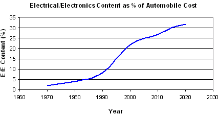 汽車電子和電器設(shè)備以平均每輛車每年超過(guò)110W的速度遞增,最近,過(guò)去由機(jī)械力和液壓力推動(dòng)的系統(tǒng)都改由電力驅(qū)動(dòng),對(duì)電能的大部分需求都源于此。上世紀(jì)80年代出現(xiàn)的防抱死剎車系統(tǒng)(ABS)具有存儲(chǔ)容量大約為8KB電子控制單元;而現(xiàn)代的第五代ABS硬件配備128KB的存儲(chǔ)器,大小僅僅為早期系統(tǒng)的40%。由于設(shè)計(jì)精巧和創(chuàng)新,現(xiàn)代電氣/電子系統(tǒng)對(duì)功率的要求通常比最初推出的系統(tǒng)要小。