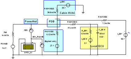 在上圖中,汽車充電系統(tǒng)由交流發(fā)電機(jī)和鉛酸電池來(lái)表示。在這種情況下,要利用Ansoft公司的汽車工具箱之中的Simplorer電化學(xué)建模工具對(duì)電池進(jìn)行比較詳細(xì)的建模。PowerNet被高度簡(jiǎn)化為由線規(guī)電阻建模的四個(gè)分支電路,包括引擎控制、車箱氣候控制、本地ECU和EPS(最右邊)。PowerNet分配點(diǎn)被標(biāo)注為PDB或電力分配箱。