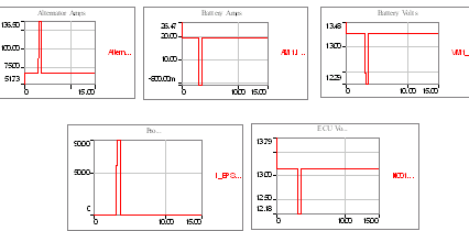 當(dāng)EPS工作時(shí),下圖描繪了上述電路引起的PowerNet瞬態(tài)波動(dòng)。注意:當(dāng)電力分配網(wǎng)絡(luò)穩(wěn)定時(shí),交流發(fā)電機(jī)提供給電池的最初充電電流。[page]