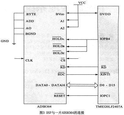 TMS320LF4207A本身雖然自帶A/D轉(zhuǎn)換器,但其轉(zhuǎn)換精度只有10位,且轉(zhuǎn)換速度也不高(500ns)。為了實(shí)現(xiàn)更高的速度和精度,選擇了擴(kuò)展ADS8364芯片。ADS8364是一種高速、低功耗、雙16bA/D轉(zhuǎn)換器,有6個(gè)模擬量輸入通道??捎肂VDD獨(dú)立供電。它有6個(gè)完全相同的采樣保持電路,分成A、B、C3組,每一組都由1個(gè)HOLD引腳控制。ADS8364可以從外部引入最大5MHz的時(shí)鐘頻率,此時(shí)采樣時(shí)間是0.8μs,轉(zhuǎn)換時(shí)間只有3.2μs,A/D的最大采樣率達(dá)到250K,要達(dá)到此值,可在下一次轉(zhuǎn)換開(kāi)始時(shí)讀取上一次的轉(zhuǎn)換結(jié)果。此A/D完全可以滿(mǎn)足本裝置的采樣要求。AD芯片與DSP的連接如圖3所示。
