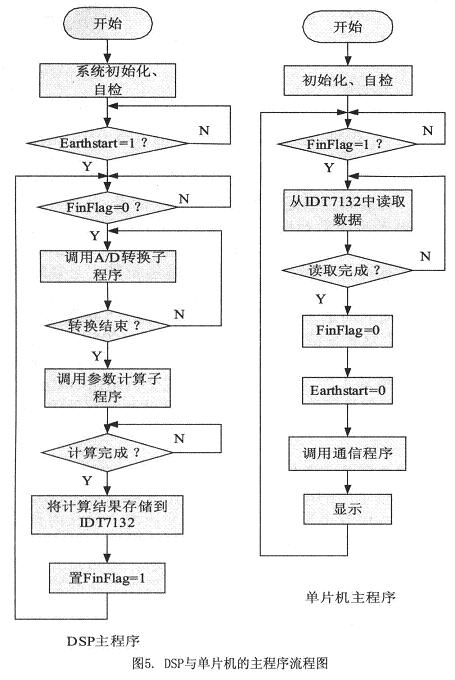 FinFlag為計(jì)算完成標(biāo)志。外部輸入的電壓、電流信號(hào)經(jīng)過(guò)輸入轉(zhuǎn)換電路變?yōu)榈蛪盒⌒盘?hào),經(jīng)過(guò)平移電路和信號(hào)調(diào)理,成為可以直接被A/D轉(zhuǎn)換的采樣信號(hào),輸入A/D轉(zhuǎn)換器。DSP芯片從A/D的寄存器中讀取數(shù)據(jù)。當(dāng)所有的轉(zhuǎn)換都結(jié)束時(shí),DSP啟動(dòng)數(shù)據(jù)處理程序,即應(yīng)用小波分析對(duì)數(shù)據(jù)進(jìn)行分析和計(jì)算。計(jì)算完成后,將計(jì)算結(jié)果存儲(chǔ)在雙口RAM中,并把FinFlag標(biāo)志置1。當(dāng)單片機(jī)查詢(xún)到此標(biāo)志為真時(shí),啟動(dòng)數(shù)據(jù)讀取程序,從雙口RAM中讀取DSP已經(jīng)運(yùn)算完成的數(shù)據(jù)。當(dāng)讀取完成時(shí),F(xiàn)inFlag和Earthstart標(biāo)志都置為0,然后完成顯示任務(wù)和串行通信任務(wù)。系統(tǒng)等待下一次接地故障的發(fā)生。