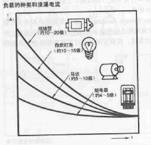 沖擊電流的產(chǎn)生和負(fù)載的種類和特性有關(guān),和通斷頻率也有關(guān)系。特別是在有沖擊電流存在的負(fù)載的情況請(qǐng)與穩(wěn)態(tài)電流一起測(cè)定沖擊電流值。下圖顯示了有代表性的負(fù)載種類與沖擊電流的關(guān)系。