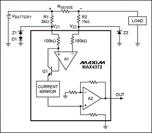 圖1給出了一個過壓保護例子,由齊納二極管Z1和Z2、電阻R1和R2以及二極管D1組成。MAX4372放大器的共模電壓范圍為0至28V,足以測量6V至18V范圍的汽車電池電壓。但是,拋負載電壓可能達到35V,而且會持續(xù)0.5秒,恰好超過了放大器的30V最大額定輸入電壓,必須通過外部電路保護放大器。