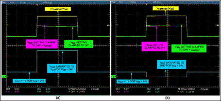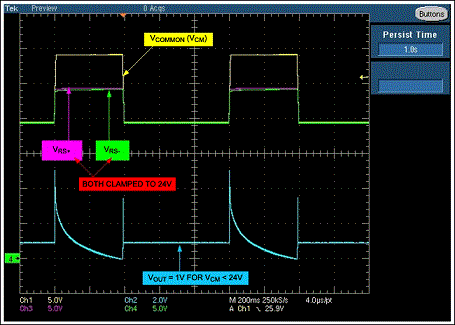 圖2是當(dāng)移走D1時,35V拋負載脈沖下放大器的輸出。施加電壓為電池標稱電壓,所要求的輸出電壓為1V(輸入VSENSE=50mV、增益=20)。出現(xiàn)拋負載電壓時,齊納管把輸入共模電壓鉗位在大約24V,放大器輸出經(jīng)過幾個短暫的波動后穩(wěn)定到0V。