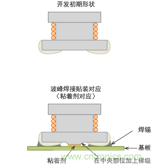 在 生產(chǎn)第一代LQN5N及第二代LQH32M時(shí),雖會對部分混合IC基板進(jìn)行回流焊接,但一般是對裝有插腳零部件的基板背面進(jìn)行波峰焊接。其貼裝方法是將膠 粘劑涂在基板焊盤的中央部或貼片元件電極的中央部,待其固化后將其投入波峰焊接槽。與CR貼片元件相比,體積較大的LQH系列在受到焊錫流動阻力后易發(fā)生 脫落,因此在電極間中央部位設(shè)計(jì)了突起(稱為梯級磁芯)?,F(xiàn)在看來的話,是反向支架形狀。至今再也見不到這種結(jié)構(gòu)。