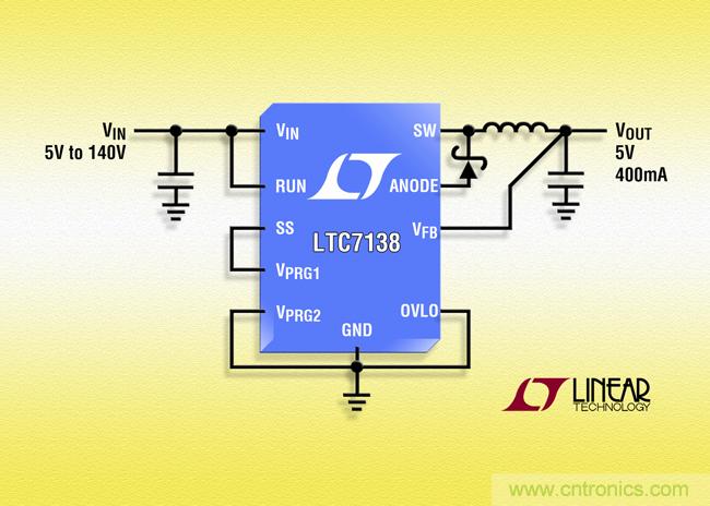【導讀】近日,凌力爾特公司宣布推出 擁有140V 輸入的高效率降壓型轉(zhuǎn)換器 LTC7138,該器件提供高達 400mA 連續(xù)輸出電流,靜態(tài)電流僅為 12µA 的 140V、400mA 。LTC7138 在 4V 至 140V 輸入電壓范圍內(nèi)工作,因此非十分適合電信、汽車、航空電子和工業(yè)等多種應用。