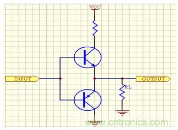 集電極開路輸出的結(jié)構(gòu)如圖1所示,右邊的那個三極管集電極什么都不接,所以叫做集電極開路(左邊的三極管為反相之用,使輸入為"0"時,輸出也為"0")。對于圖1,當左端的輸入為“0”時,前面的三極管截止(即集電極C跟發(fā)射極E之間相當于斷開),所以5V電源通過1K電阻加到右邊的三極管上,右邊的三極管導通(即相當于一個開關(guān)閉合);當左端的輸入為“1”時,前面的三極管導通,而后面的三極管截止(相當于開關(guān)斷開)。