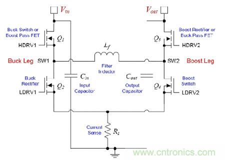圖1. 4開關(guān)同步降壓-升壓轉(zhuǎn)換器功率級(jí)。