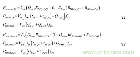 方程式12和13分別計(jì)算降壓和升壓模式下的傳導(dǎo)、開關(guān)和柵極驅(qū)動(dòng)損耗。針對(duì)降壓-升壓模式的相應(yīng)表達(dá)式是方程式12和13的權(quán)重組合,其依據(jù)是降壓-升壓窗口中的運(yùn)行點(diǎn),并且將頻率除以2。