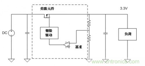 圖1. 線性穩(wěn)壓器框圖。注意,旁路元件將在其自身和負荷之間形成一個分壓器,起到耗散功率的作用。
