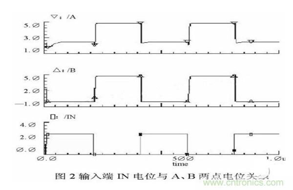 實際上,B點電位與負(fù)載電容和電容Cboot的大小有關(guān),可以根據(jù)設(shè)計需要調(diào)整。具體關(guān)系將在介紹電路具體設(shè)計時詳細(xì)討論。在圖2中給出了輸入端IN電位與A、B兩點電位關(guān)系的示意圖。