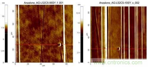 圖3.不同蝕刻時(shí)間會(huì)在晶圓表面留下不同程度的階褶。圖左的蝕刻時(shí)間為二分之一參考時(shí)間,圖右為三倍參考時(shí)間。