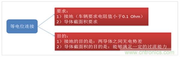 ③ISO 6469-3 Electrically propelled road vehicles-Safety specification-Part3:Protection of persons against electric shock GB/T 18384-3對等電位連接的設(shè)計要求、測試要求在標準6.3.1和6.9中做了明確規(guī)定。