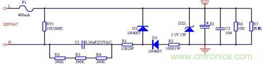 DZ1:穩(wěn)壓二極管,選用1N4733,穩(wěn)壓電壓Vz為5.1V。DZ1的最大穩(wěn)壓電流Iz必須大于電容C1最大充放電電流。