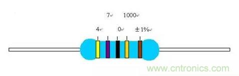 所以,黃色在第一環(huán)就是4,第二環(huán)紫色為7,第三環(huán)黑色是0,第四環(huán)就是乘積了10的3次方也就是1000,第五環(huán)是誤差了棕色為±1%?,F(xiàn)在我們來(lái)計(jì)算阻值:470*1000=470K,然后誤差是±1%,所以阻值的范圍是在465.3K—— 474.7K之間,其阻值都是正常的。