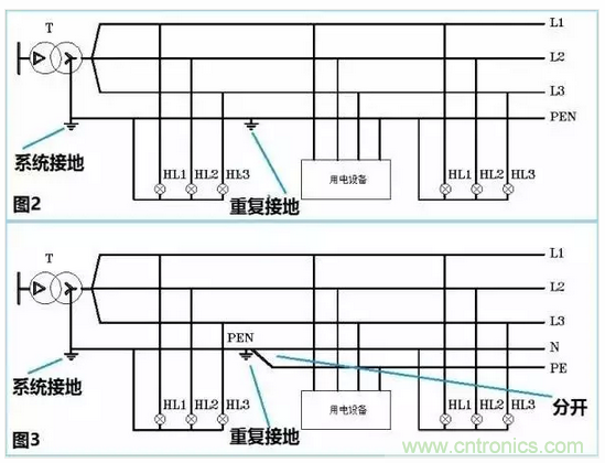 注意哦,圖2對應(yīng)的接地系統(tǒng)叫做TN-C,而圖3對應(yīng)的接地系統(tǒng)叫做TN-C-S。