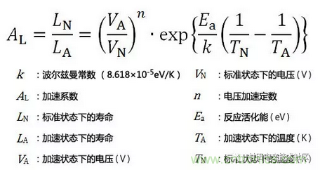 在此公式的基礎(chǔ)上,通過(guò)在更為嚴(yán)苛的條件(更高溫、更高電壓)下進(jìn)行加速試驗(yàn),可推算出產(chǎn)品在實(shí)際使用環(huán)境下的使用壽命。