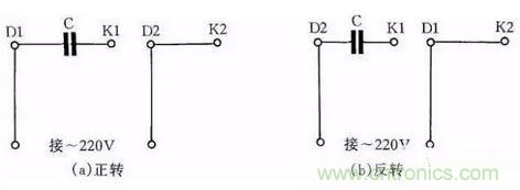 圖4是JX07A-4型單相電容運轉電動機接線方法。電動機功率為60W,用220V/50Hz交流電源、電流為0.5A。它的轉速為每分鐘1400轉。電容選用耐壓400~500V、容量8μF的產(chǎn)品。圖4(a)為正轉接線,圖4(b)為反轉接線。