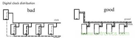 對應地線回路規(guī)則,實際上也是為了盡量減小信號的回路面積,多見于一些比較重要的信號,如時鐘信號,同步信號;對一些特別重要,頻率特別高的信號,應該考慮采用銅軸電纜屏蔽結(jié)構(gòu)設計,即將所布的線上下左右用地線隔離,而且還要考慮好如何有效的讓屏蔽地與實際地平面有效結(jié)合。