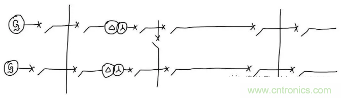 發(fā)電機(jī)接到低壓母線,再通過升壓變壓器把電壓升高(比如說升高成220kV),經(jīng)過輸電線路輸送到220kV變電站。這里就需要發(fā)電機(jī)保護(hù)、變壓器保護(hù)、母線保護(hù)和線路保護(hù)。對(duì)于發(fā)電機(jī)保護(hù),我們希望發(fā)電機(jī)故障時(shí)只切除故障的發(fā)電機(jī),不影響非故障設(shè)備正常運(yùn)行,而只切除發(fā)電機(jī)出口斷路器就可以實(shí)現(xiàn)只停故障發(fā)電機(jī)的目標(biāo),所以我們把保護(hù)區(qū)的邊界劃到了發(fā)電機(jī)出口斷路器旁邊的電流互感器,如下圖: