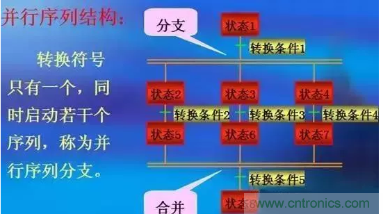 并行序列的結(jié)束稱為合并。轉(zhuǎn)換符號(hào)在水平線以下,當(dāng)雙水平線之上的所有前級(jí)都處于活動(dòng)狀態(tài)時(shí),且轉(zhuǎn)換條件成立,則下一步被激活。同時(shí)所有前級(jí)步都變?yōu)椴换顒?dòng)步。