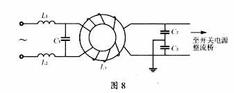為更好抑制EMI對電路的一些改進(jìn)本電路中主要的EMI是電源噪聲對電網(wǎng)的干擾??蓪⒃瓉淼墓材6罅魅2與電容C10、C1組成的濾波電路,改善為如圖8所示電路,則L1、L2、C1可除去差模干擾,L3、C2、C3可除去共模干擾。L1、L2的磁芯為不易飽和的材質(zhì)。C1可選陶瓷電容,耐壓必須考慮輸入電壓的最大可能值,通常選用0.22~0.47μF。L3是共模扼流圈。選定C=C2=C3,截止頻率f0,則可根據(jù)計(jì)算L3;選定C1,截止頻率f0,可計(jì)算出L1、L2。