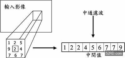 圖說:中值濾波器的運作概念示意圖。