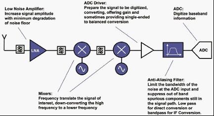 那么,什么樣的設(shè)計(jì)是一個(gè)較好的射頻系統(tǒng)設(shè)計(jì)呢?首先,信號(hào)靈敏度要高,這意味著較低的噪聲,時(shí)鐘引入的相位噪聲同樣要低。輸入信號(hào)要有足夠的驅(qū)動(dòng)能力,相關(guān)的指標(biāo),如高的三階截點(diǎn)和1dB壓縮點(diǎn)。然后就是各個(gè)模塊的性能是否足夠好,是否能較好的區(qū)分信號(hào)和噪聲,線性度是否足夠好等等。另外呢就是低功耗低成本等方面的考慮了。