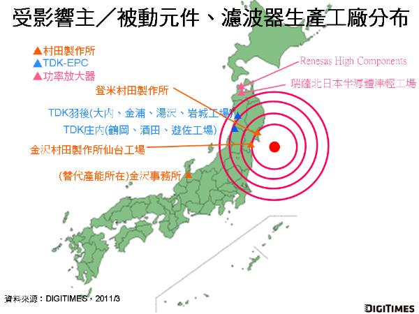 DIGITIMES Research最新報告指出,日本311強震造成日廠手機/平板相關(guān)零組件供應商分別遭受廠房、設(shè)備損壞,亦或海嘯沖擊、地方分區(qū)限電等影響,工廠作業(yè)停擺,影響超過20處工廠,在災后截至2011年3月16日仍未能正常作業(yè)。
