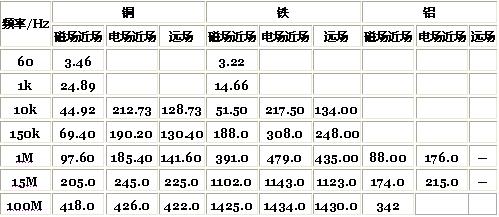 場源距離不同材料的屏蔽體(厚度0.254mm)30cm遠的屏蔽效能(dB)計算結(jié)果見表1。表1中近場和遠場的分界點為λ/2π,λ為電磁場的波長。