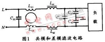 開關(guān)電源的開關(guān)頻率及其諧波的主要表現(xiàn)是電源線上的干擾,稱之為傳導(dǎo)干擾。傳導(dǎo)干擾分為共模干擾和差模干擾。共模干擾是由載流導(dǎo)體與大地之間的電位差產(chǎn)生的,其特點是兩條線上的干擾信號電壓是同電位同相的;而差模干擾則是由載流導(dǎo)體之間的電位差產(chǎn)生的,其特點是兩條線上的干擾信號電位相同,但相位相反。事實上,針對不同的干擾信號,EMI濾波電路也分為抗共模干擾濾波電路和抗差模干擾濾波電路,圖1所示是其濾波電路。