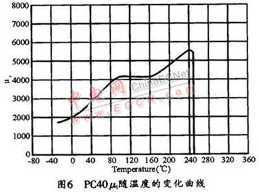 中小功率的EMI濾波器產(chǎn)品中選用最多的磁芯材料是日本TDK公司 的PC40 (它是目前業(yè)界廣泛使用的較好的材料之一),它的初始磁導(dǎo)μi隨溫度的變化曲線如圖6所示。從圖中可看出,溫度變化對μi的影響是很大的,磁芯溫度在 90~150℃的區(qū)間內(nèi),有一段平坦區(qū),這時它的μi大約在4100左右;當(dāng)溫度低于90℃后,μi值會隨著溫度的降低而逐漸減小,到0℃時,μi值只有 2000左右,進(jìn)到負(fù)溫區(qū)后,μi值還會進(jìn)一步減??;而當(dāng)溫度高于150℃后,μi值則會隨著溫度的升高而增加,當(dāng)達(dá)到240℃時,μ的最大值為5600 左右;從240℃開始,μi值又漸漸減小,當(dāng)溫度達(dá)到居里溫度點250℃時,材料失去磁性。