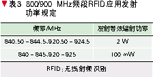 信息產(chǎn)業(yè)部于2007年4月23日發(fā)布了信部無[2007]205號文件《關(guān)于發(fā)布800/900 MHz頻段射頻識別(RFID)技術(shù)應(yīng)用試行規(guī)定的通知》,規(guī)定800/900 MHz頻段RFID技術(shù)的具體使用頻率為840~845 MHz和920~925 MHz.表3給出了發(fā)射功率的規(guī)定。