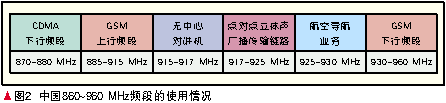 圖2顯示了中 國在860~960 MHz頻段的頻率使用現(xiàn)狀,920~925 MHz的RFID頻段實(shí)際上是立體聲廣播點(diǎn)對點(diǎn)傳輸業(yè)務(wù)頻段分出5 MHz與RFID共用,與GSM上/下行頻段只有5 MHz的頻率間隔,與無中心對講機(jī)系統(tǒng)只有3 MHz的頻率間隔。