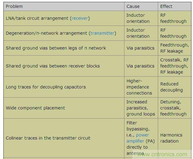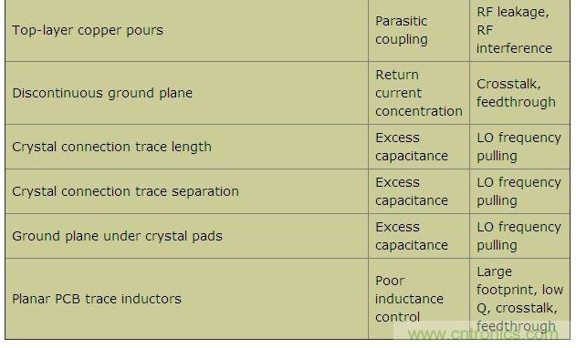 本文羅列了各種不同的設(shè)計疏忽,探討了每種失誤導(dǎo)致電路故障的原因,并給出了如何避免這些設(shè)計缺陷的建議。本文以FR-4電介質(zhì)、厚度0.0625in的雙層PCB為例,電路板底層接地。工作頻率介于315MHz到915MHz之間的不同頻段,Tx和Rx功率介于-120dBm至+13dBm之間。表1列出了一些可能出現(xiàn)的PCB布局問題、原因及其影響。