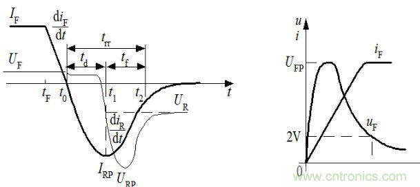 在開關(guān)電源中常使用工頻整流二極管、高頻整流二極管、續(xù)流二極管等,由于這些二極管都工作在開關(guān)狀態(tài),如圖所示,在二極管由阻斷狀態(tài)到導(dǎo)通工作過程中,將產(chǎn)生一個很高的電壓尖峰VFP;在二極管由導(dǎo)通狀態(tài)到阻斷工作過程中,存在一個反向恢復(fù)時間trr,在反向恢復(fù)過程中,由于二極管封裝電感及引線電感的存在,將產(chǎn)生一個反向電壓尖峰VRP,由于少子的存儲與復(fù)合效應(yīng),會產(chǎn)生瞬變的反向恢復(fù)電流IRP,這種快速的電流、電壓突變是電磁干擾產(chǎn)生的根源。