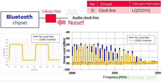 第一個(gè)區(qū)域是電源線,第二個(gè)區(qū)域是時(shí)鐘線。由于電源線由于切換而產(chǎn)生更高的諧波,并且時(shí)鐘信號的高次諧波延伸到2.4GHz頻帶,因此在藍(lán)牙信號中產(chǎn)生噪聲。濾波是抑制噪聲傳導(dǎo)的有效方法。