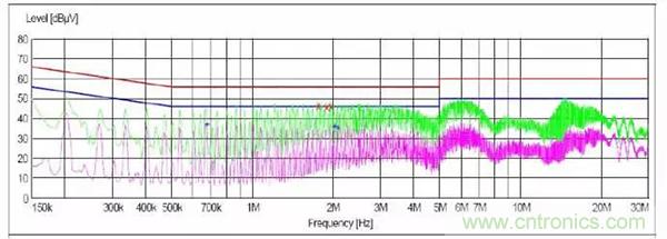 上圖藍(lán)色和黑色線是輸出正負(fù)端,上面套了個(gè)磁環(huán),解決了輸出整流管引起的高頻端超出;有些時(shí)候端口的干擾在PCB板上加濾波器未必有效果,在輸出線上放磁環(huán)就有想不到的效果。