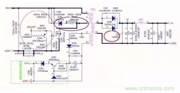 右邊綠色虛線方框部分,是MOS管關(guān)斷尖峰吸收電路,一樣與MOS管構(gòu)成環(huán)路要最??;