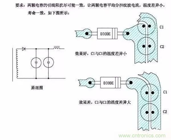 圖一是副邊整流濾波走法,使二個(gè)電容效果分?jǐn)?,避免第二個(gè)電容在整流回路中失效。