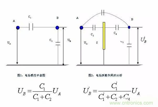 如圖對(duì)照:輸入和輸出的電場(chǎng)干擾可以通過電容傳輸耦合,若增加屏蔽板,則增加了C4的大小,并且C1也會(huì)減小,對(duì)電場(chǎng)干擾起到衰減的目的;