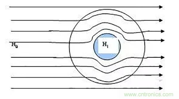磁場(chǎng)屏蔽原理,磁場(chǎng)通過屏蔽罩會(huì)改變磁路,導(dǎo)致磁力線向周圍擴(kuò)散,中間磁場(chǎng)干擾達(dá)到屏蔽目的;
